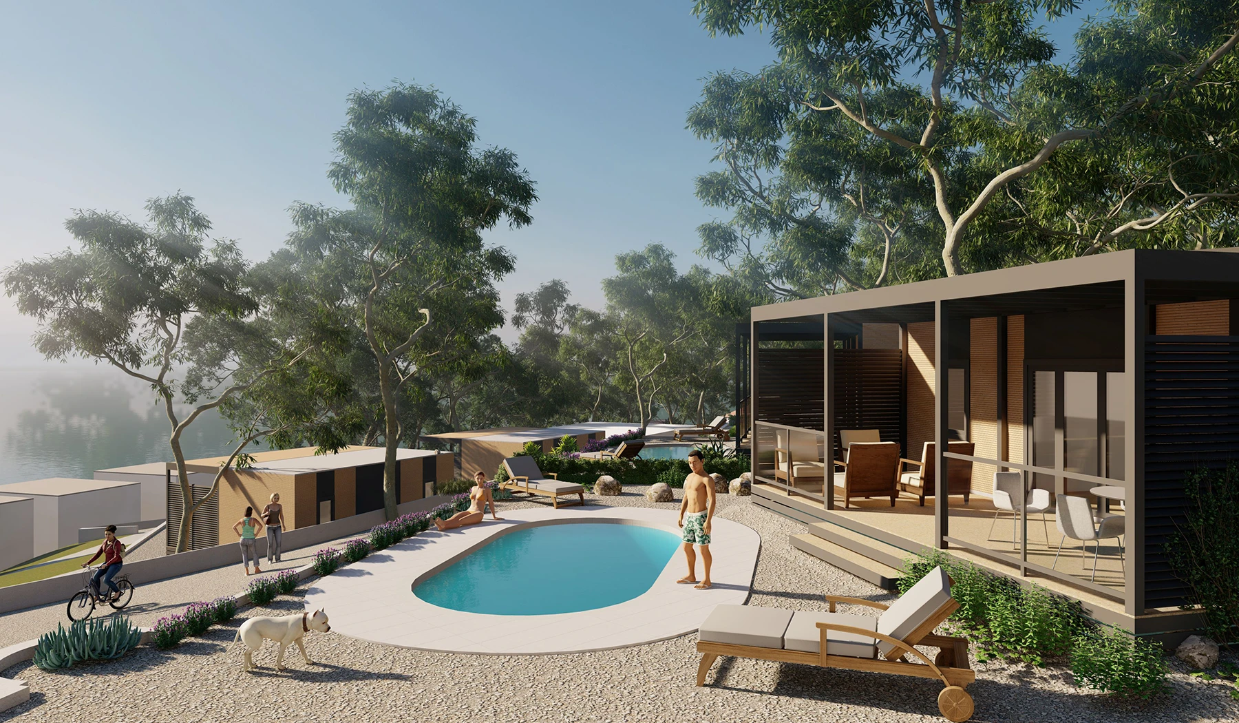 Kauč na razvlačenje u dnevnom boravku pruža dodatni prostor za spavanje po potrebi. Unutarnji prostor iznosi 32 m² i proteže se na privatnu terasu od 24 m².